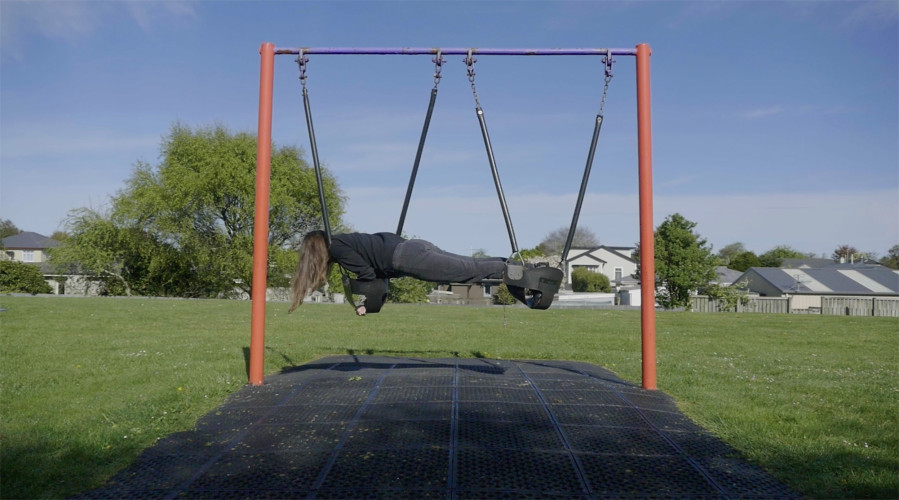 Nela Fletcher explores how the body occupies and interacts with space as it shifts between subject, medium, and catalyst. The Swiss-born artist, currently based in Hangzhou, China, was previously located in Invercargill, where the material for Playground Rebel was filmed. Playgrounds are ubiquitous features across urban landscapes, conventionally seen as sites for children’s play. The artist reconfigures and enlivens the space by conducting her own frieze-like choreography among the equipment and objects, where angles, orientation, and staged poses negotiate the contours and scaffolding of the architecture. This idiosyncratic performance embodies resistance, mobilised to recontextualise and reinvent understandings of public places and urban environments.