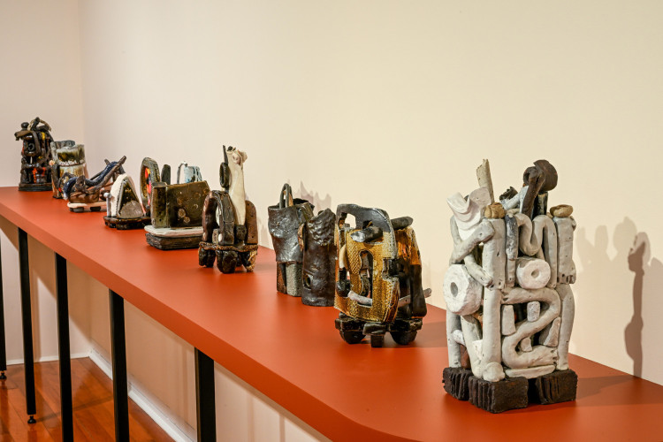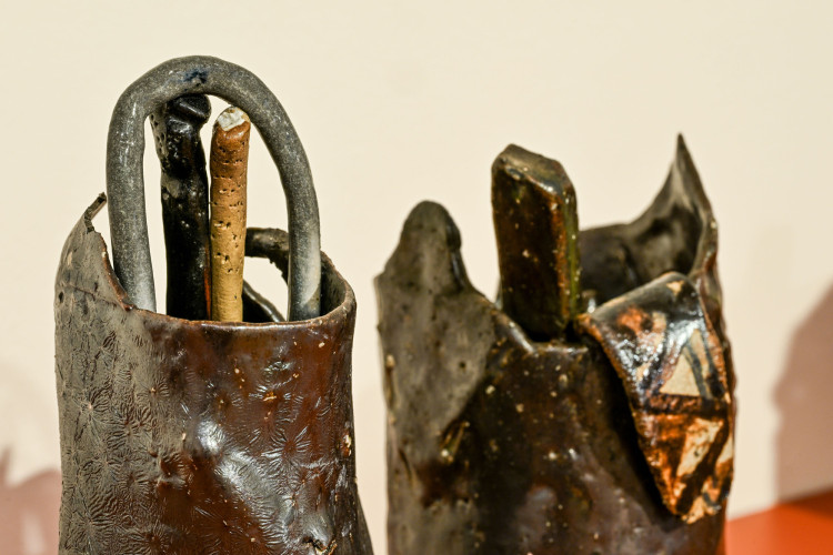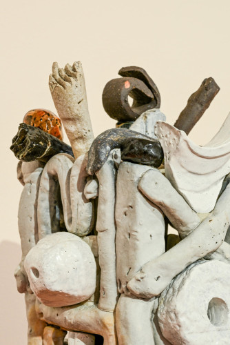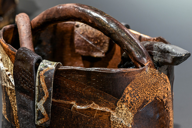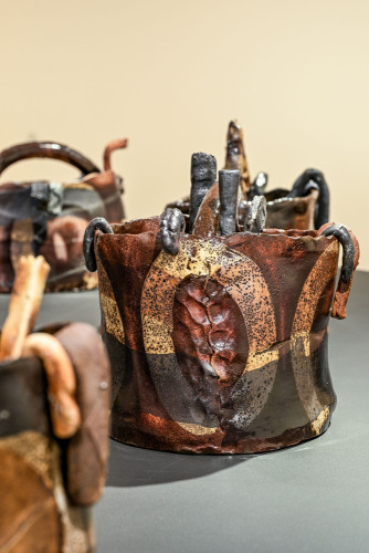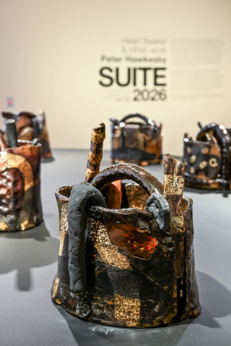 Heart Basket & other work brings Hawkesby’s recent series Heart Basket (2023-25) together with what he calls ‘re-jigged’ works – assemblages that are built from ceramic bits and pieces that accrue in his studio over time. There is a different tenor across the two bodies of work: where the series Heart Basket is grounded and contemplative, the post-kiln constructions are energetic and lively. Together, they offer an introduction to Hawkesby’s practice that celebrates the elastic nature of his work – pushing and pulling between past and present, while grounded in a love of clay and its possibilities.